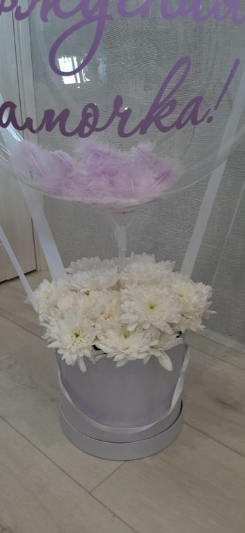 Композиция в шляпной коробке Bubbles (надут воздухом) и хризантемами кустовыми (9 штук).